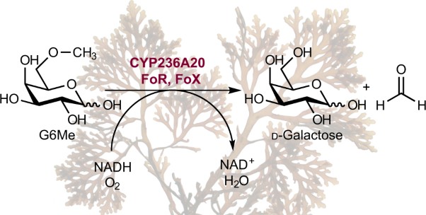 The discovery of cytochrome P450 monooxygenases that catalyze oxidative demethylation of 6-O-methyl-D-galactose reveals a new activity of cytochrome P450 enzymes and their role in polysaccharide biomass degradation in marine bacteria.