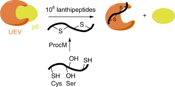The substrate-tolerant lanthipeptide synthetase ProcM enables the construction of a plasmid-encoded library of bicyclic lanthipeptides, from which an inhibitor of the p6UEV proteinprotein interaction is identified by a reverse two-hybrid screen.