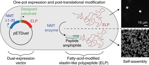 Genetically encoded lipid–polypeptide hybrid biomaterials that exhibit temperature-triggered hierarchical self-assembly pp496 - 505 Davoud Mozhdehi, Kelli M. Luginbuhl, Joseph R. Simon, Michael Dzuricky, Rüdiger Berger et al. doi:10.1038/s41557-018-0005-z Inspired by the post-translational modifications of polypeptides widespread in biological systems, the one-pot synthesis of biohybrid materials was engineered within Escherichia coli using a recombinant expression and post-translational lipidation. The fatty-acid-modified elastin-like polypeptides (FAMEs) prepared, which comprise peptide-amphiphile segments prone to self-assembly fused to a thermally responsive elastin-like polypeptide, exhibit temperature-triggered hierarchical assembly. |