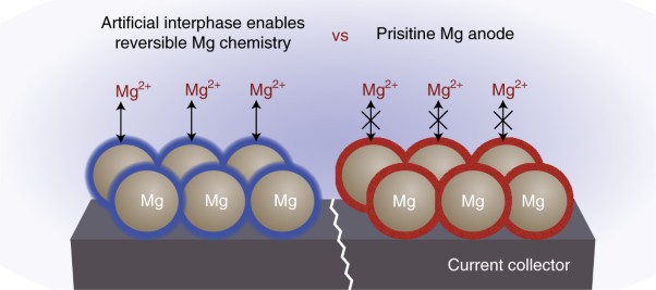 An artificial interphase enables reversible magnesium chemistry in carbonate electrolytes pp532 - 539 Seoung-Bum Son, Tao Gao, Steve P. Harvey, K. Xerxes Steirer, Adam Stokes et al. doi:10.1038/s41557-018-0019-6 Mg-based batteries possess potential advantages over their lithium counterparts; however, the use of reversible oxidation-resistant, carbonate-based electrolytes has been hindered because of their undesirable electrochemical reduction reactions. Now, by engineering a Mg2+-conductive artificial interphase on a Mg electrode surface, which prevents such reactivity, highly reversible Mg deposition/stripping in carbonate-based electrolytes has been demonstrated. |