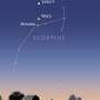 ![]() | Two pairs of planets perform in the August twilightStep outside as the stars come out, look southwest, and you'll see an eye-catching pattern. For the next few days (August 17–22, 2016), bright orange Mars shines to the right of Saturn and the reddish star Antares. The three form a tall triangle that changes every night. |